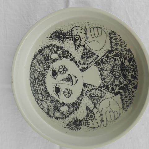 Fad/skål i glaseret porcelæn med sort udsmykning af figur. Stemplet nedenunder „Nymölle, Danmark, Kunstnere, Björn Wiinblad, 3029-1285".