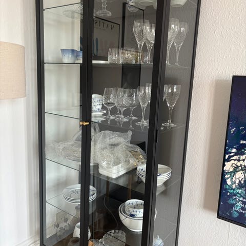 Sort vitrineskab. Med låger der kan åbnes foran og på begge sider.