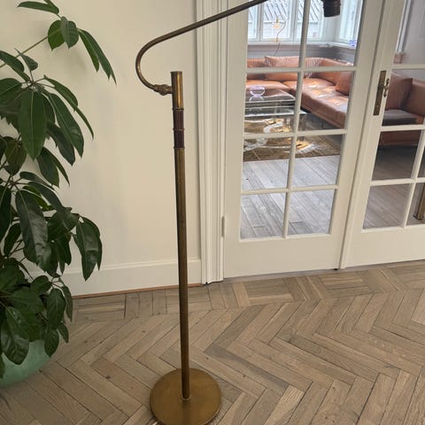 Svensk antik gulvlampe som har et metalstel med dekorative detaljer og en justerbar arm, så skærmens position kan tilpasses til siden og op og ned. Skærmen er original og giver et varmt og diffust lys. Velegnet som læselampe eller stemningsbelysning i stue, soveværelse eller kontor.