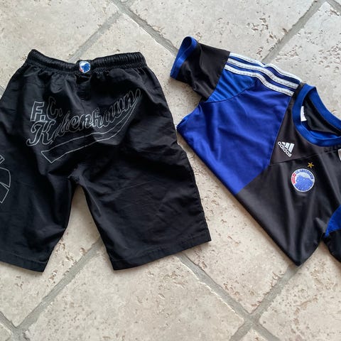 Fake F.C. København fodboldshorts i hvid med blå kant nederst på benene. Shortsene har elastik i taljen og klubbens logo broderet på det ene ben. Egnede til fodbold og anden sport eller som træningsshorts. Materialet fremstår som let og åndbart syntetisk stof.
