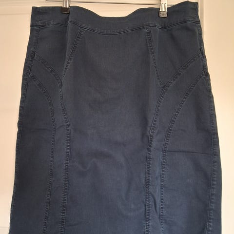 Marineblå/hvid stribet nederdel i blød jersey. Striberne danner et V. Elastisk linning. God vidde i skørtet. Behagelig at have på mod bare ben.