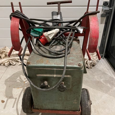 Svejsesæt på vogn med tilhørende gasflasker, slanger og manometre. Sættet består af en transportvogn med hjul, monterede flasker, flere trykregulatorer med manometre samt svejseslanger i forskellige længder. Udstyret er egnet til autogen- eller gassvejsning og skæring, hvor der er behov for mobilitet i værksted eller garage. Alle dele fremstår samlet på vognen, klar til tilslutning efter købers egne sikkerheds- og funktionskontroller.
