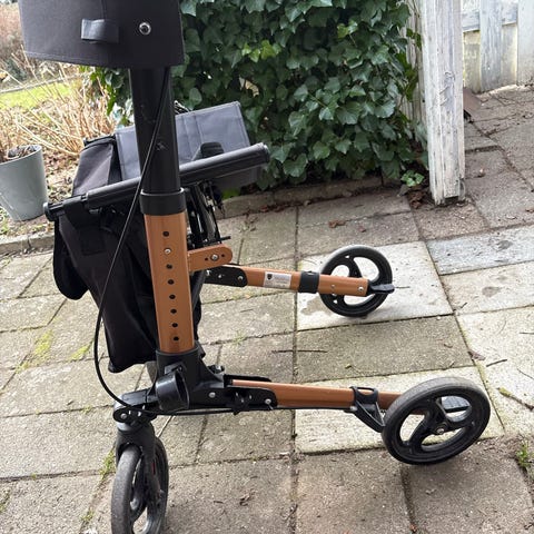 Jaguar Suprême Mobylex rollator med sæde i trælook og sort opbevaringskurv under sædet. Rollatoren har håndbremser på begge håndtag og fire hjul for stabil kørsel indendørs/udendørs. Stellet er i lys farve med sorte detaljer. Egnet som ganghjælpemiddel til voksne, hvor der er behov for støtte ved gang samt mulighed for at sidde og hvile undervejs.