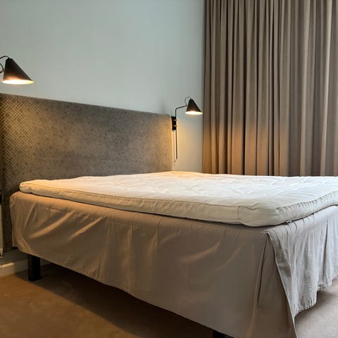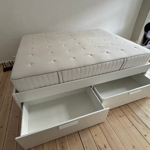 IKEA-seng. Højden er 175 cm med top-madrassen på. Rigtig fin stand. Gråt betræk så træværket på sengen dækkes til følger også med! Kan ikke ses på billedet. To store gode boxmadrasser!