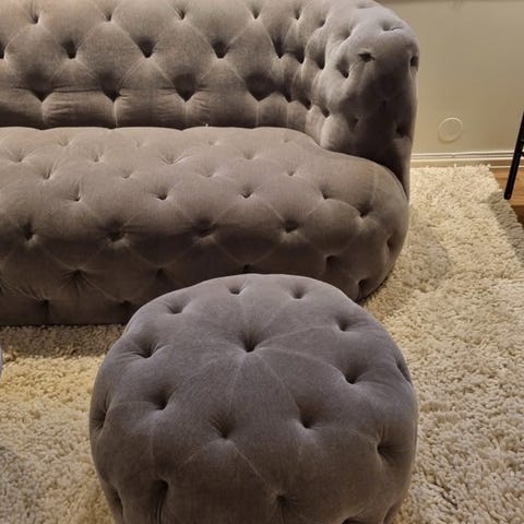 Sofaen er i god stand og super behagelig, materialet er Velour Lux Navy, og den er for nylig blevet fuldstændig rengjort.
