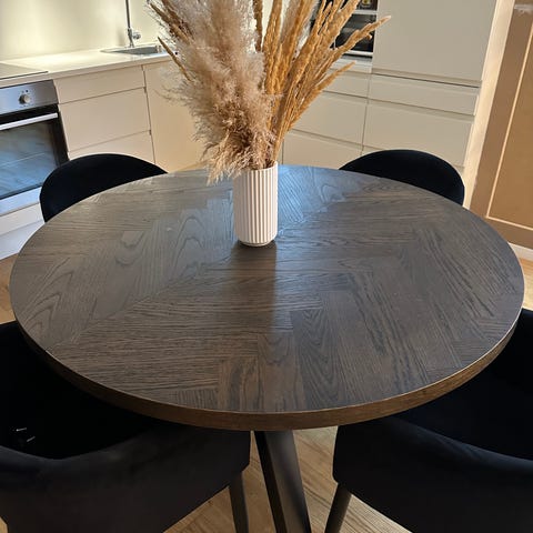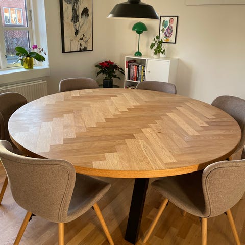 Meget smukt, rundt sildebens bord lavet af snedker på bestilling i 2020. Der er lidt plamager på overfladen, som med lidt pleje nok kan fjernes eller nedtones. Benene kan skrues af og på uden problem. Håber det kan finde et godt nyt hjem.