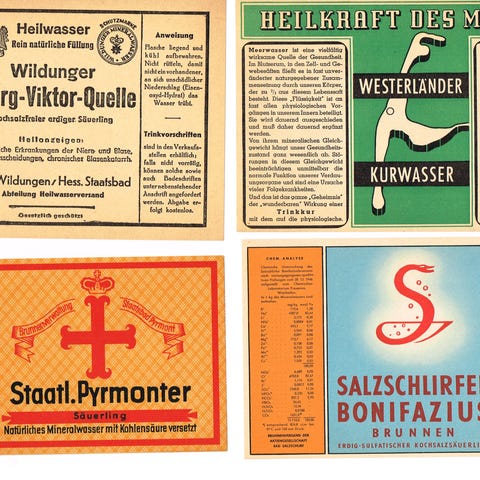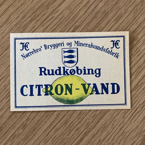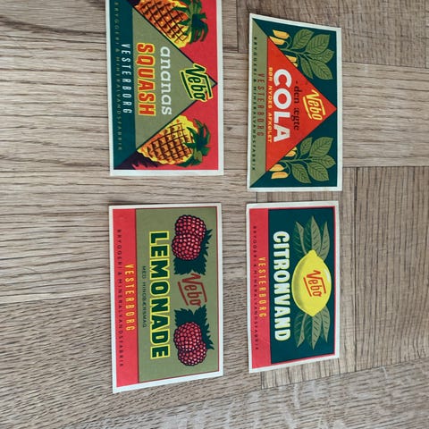 Originale etiketter til Kerteminde mineralvand i forskellige varianter.