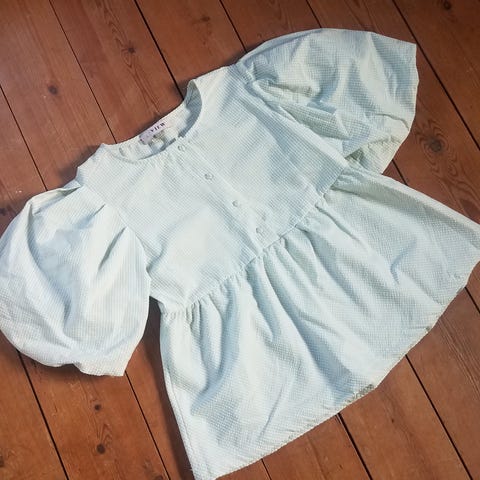 • Detaljer: Fine flæser ved kraven, knaplukning foran og voluminøse ærmer med flæsedetaljer.