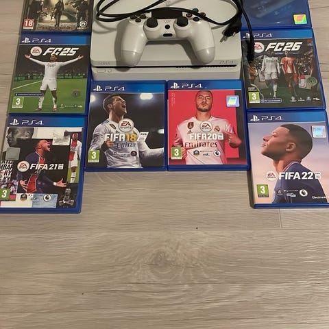 Sony Playstation 4 slim i sort. Flot stand, kun brugt få gange, som ny. Slim-model med frontbetjening og to USB-porte på forsiden. Konsollen anvender DualShock 4 trådløs controller, som ses på billederne. HDMI kabel medfølger.