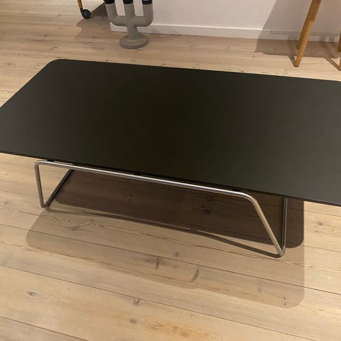 Sofabord fra Peter Boy design model E1. Linoleum bordplade og stel af børstet stål. Lille afslag på bordplade. Kan ses på billedet