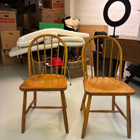 Ukendte tremmestole. Trænger til en hånd. Har lidt pletter hist og her. Sælges kun samlet. Prisen er for begge