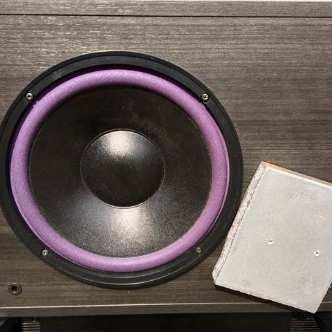 Kabinet i hvidt trælook med frontport og bundmonteret basenhed. Der medfølger RCA-kabel til tilslutning til forstærker eller receiver. Velegnet som subwoofer i et stereo- eller hjemmebio-setup, hvor der ønskes ekstra basunderstøttelse.