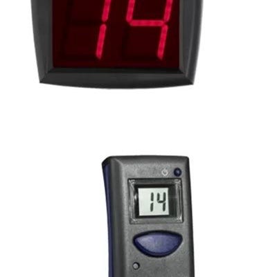 Elektronisk kønummerdisplay med stor rød digital visning og tilhørende håndholdt fjernbetjening. Displayet viser aktuelle numre tydeligt på afstand og er egnet til brug i butikker, klinikker, kontorer eller andre steder, hvor der håndteres køsystemer. Enheden tilsluttes strøm via ledning, og fjernbetjeningen har lille digital skærm til visning og styring af nummeret. Tekstfeltet på displayet kan vise information som f.eks. "NU BETJENES".