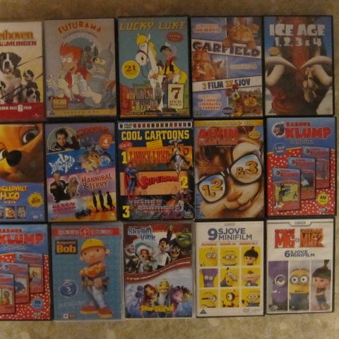 Blandet samling børnefilm på DVD og Blu-ray. Kassen indeholder forskellige titler, primært tegnefilm og familiefilm, herunder blandt andet Disney- og Pixar-film samt andre animerede og familievenlige film. Velegnet til hjemmebrug, fx til børnefilm-aftener eller som supplement til eksisterende filmsamling. Antal og konkrete titler fremgår af billederne.