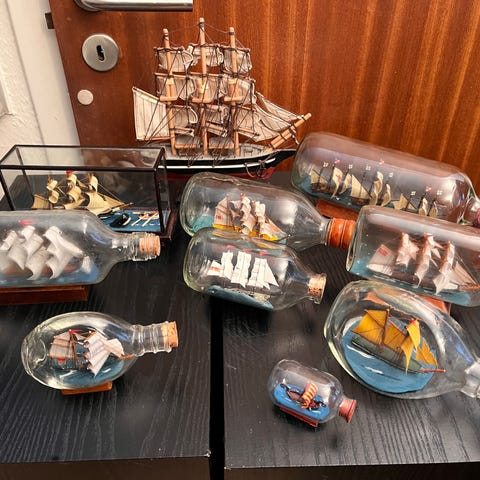 Miniature Flaskeskib i klar glasflaske med korkprop og træfod. Inde i flasken står et lille modelskib med flere sejl, malet i lyse farver med røde detaljer, placeret på en blå base, der forestiller vand. Flasken er monteret på en rektangulær træfod, så den kan stå stabilt på en hylde eller et bord. Velegnet som dekorationsgenstand eller samlerobjekt inden for maritime effekter og modelskibe. Længde 6 cm, højde 4 cm