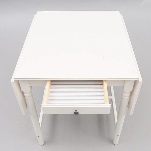 IKEA Norden klapbord i hvid. Bordet har klapfunktion, så bordpladen kan foldes ud eller ind efter behov. I midtersektionen er der indbyggede skuffer til opbevaring af fx service, tekstiler eller køkkenredskaber. Velegnet som spisebord eller arbejdsbord i mindre rum, hvor der er behov for fleksibel bordplads og ekstra opbevaring. Måler 152 cm i fuldt udslået og 89 cm hvis kun den ene plade er slået op.