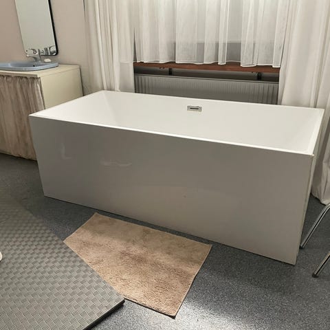 Helt nyt, aldrig brugt fritstående badekar i hvid. Badekarret har oval indvendig form med afløb i den ene ende. Glat, blank overflade og lukket yderside hele vejen rundt, velegnet til placering frit i rummet. Materialet er blankpoleret glasfiber. 175cm i toppen, 75cm bred det bredeste sted. Sælges kun fordi den er for stor at få gennem vores badeværelses 70er døråbning.