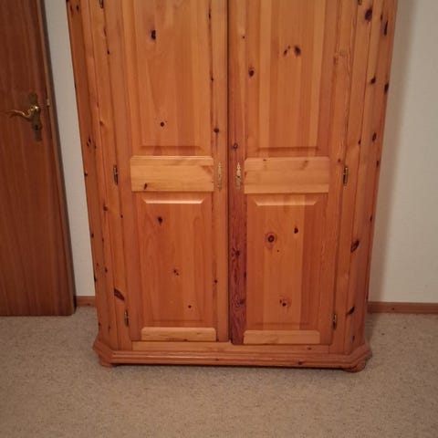 Flot og stort gammelt karlekammmerskab. Skabet har én låge med udskåret fyldning og flot udskæring på toppen. Indvendigt er der et åbent opbevaringsrum, forberedt til hylder. Står direkte på gulvet.