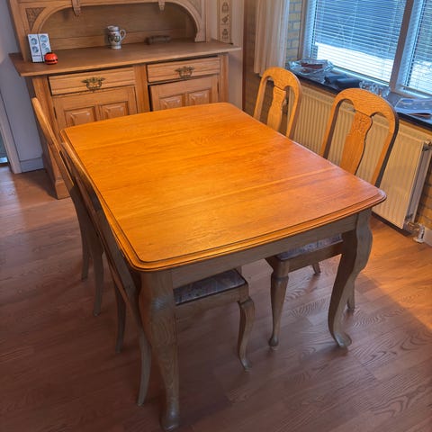 Velholdt spisebord i egetræ med 2 udtræksplader og 5 stole