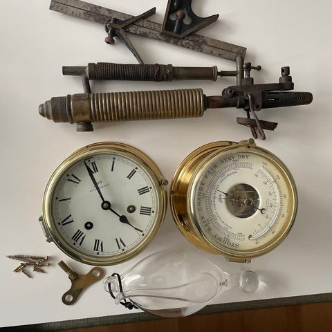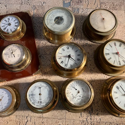 Jerger vægur, barometer og termometer i rundt messingfarvet kabinet.