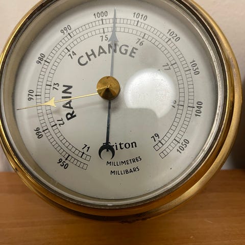 - Analogt barometer med hvid skive, skala i millimeter kviksølv samt markeringer for vejrtype. Justerskrue på bagsiden.