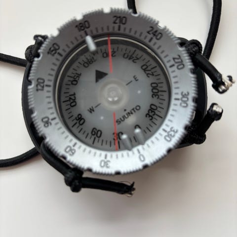 Kompas til dykning med rem. Kompasset har drejelig skive med graderingsmarkeringer og visning både ovenfra og gennem et vindue på siden. Monteres med rem, som kan spændes om håndled eller udstyr. Velegnet til brug under dykning til navigation under vandet.