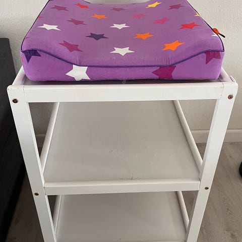 IKEA puslebord i sammenklappeligt design i hvid. Puslebordet har blød pusleflade med kant og sikkerhedsrem samt netlomme foran til opbevaring af mindre ting. Nederst er der en hylde til bleer, tøj eller andet udstyr. Stel i metal med stof- og netmateriale. Velegnet til brug i mindre rum eller hvor puslepladsen skal kunne flyttes eller klappes sammen efter behov.