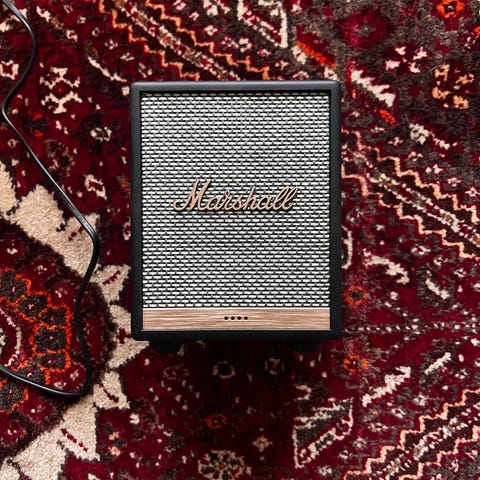 Marshall trådløs højttaler i sort med klassisk frontgitter i lys metal uden nogen brugstegn. Højttaleren har kontrolpanel på toppen med knapper og drejeknapper til volumen, bas og diskant samt tilslutningsvalg. På bagsiden findes strømtilslutning og bassrefleksport. Velegnet som stationær højttaler til brug i hjemmet, f.eks. til musikafspilning fra forskellige lydkilder via kabel eller trådløs forbindelse, afhængigt af model og tilslutninger.