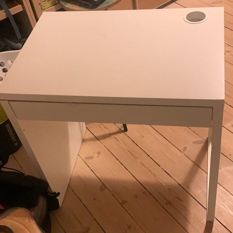 Enkelt og klassisk IKEA skrivebord i sort. Bordet har to skuffer foran til opbevaring af mindre ting som kontorartikler eller elektronik. Der er kabelhul i bordpladen så det er egnet som studieplads eller gaming i hjemmekontor, stue eller værelse.