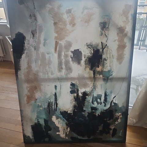 Abstrakt maleri på lærred i smalt, rektangulært format. Motivet består af tykke, strukturerede penselstrøg i flere farver, herunder grøn, gul, blå, rød og hvid. Maleriet er opspændt på en træramme, som ses fra bagsiden. Velegnet til ophængning på væg i fx stue, gang eller kontor. Præcise mål er ikke angivet.