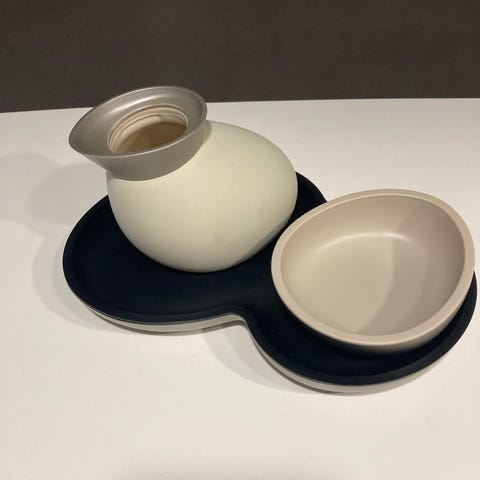 Georg Jensen sukkerskål og flødekande i sort. Sættet består af en større dobbeltformet bakke, en mindre sukkerskål samt en flødekande