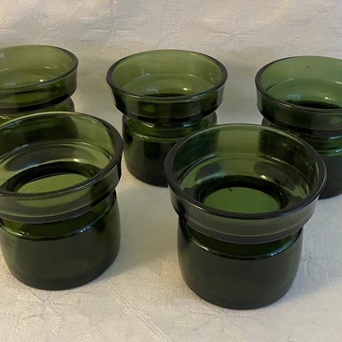 4 stk grønne løgglas fra Jens H. Quistgaard. Mål: H. 6,5 x Ø. 7 cm. Perfekt stand. Ingen skår eller revner.
