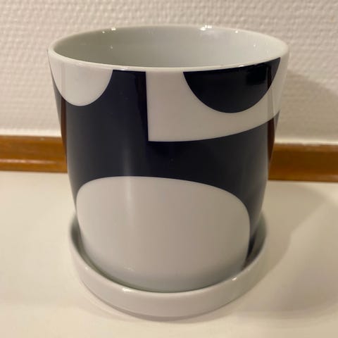 VERNER PANTON skål, udført i hvid porcelæn med udvendigt, mørkeblåt bånd. Diameter 10 cm, højde 5 cm, vægt 256 gram. Skålen er uden skår og fremstår i meget pæn stand.