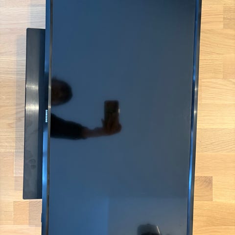 Samsung fladskærms-tv i hvid ramme. Tv’et har flere tilslutningsmuligheder på bagsiden,