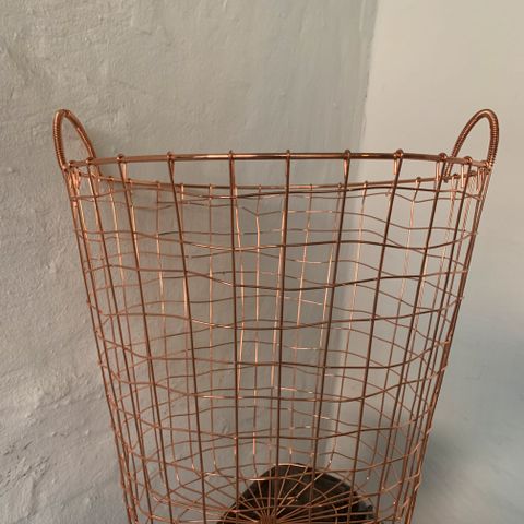 Trådkurv i sortlakeret metal. Rund model med åbent trådnet og bund i cirkulært mønster. Kurven har to integrerede håndtag i siderne, som gør den nem at flytte.