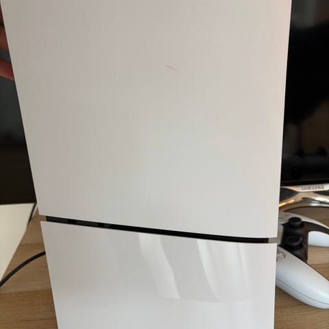 Sony PlayStation 5 spillekonsol i hvid. Konsollen er den fysiske udgave med diskdrev. Med i sættet ses to DualSense controllere, én i hvid og én i sort. Egnet til gaming i høj opløsning og med understøttelse af nyere PS5-spil samt kompatibilitet med udvalgte PS4-spil, afhængigt af spil og opsætning. Tilsluttes tv eller skærm via HDMI og har netværksforbindelse via kabel eller trådløst netværk.