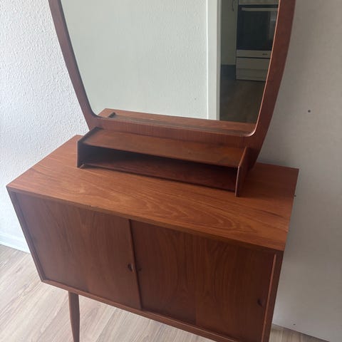 Spejl, hylde med 2 skuffer og 2 væglamper i teak