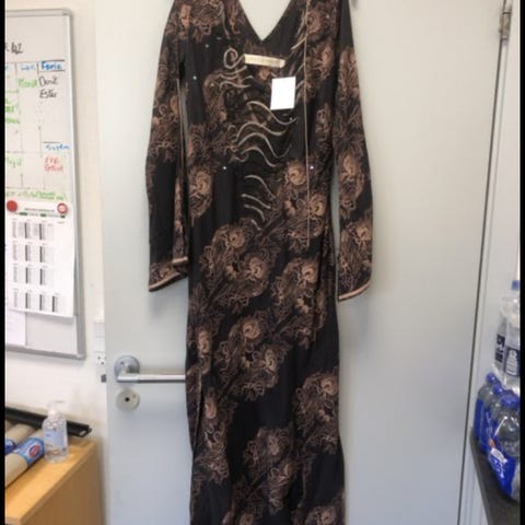 Mål: 94 cm i længden. Ærmer fra skulder: 60 cm. Bredde over tajlen (lige over det rynkede stykke) når den ligger flat er 49 cm.