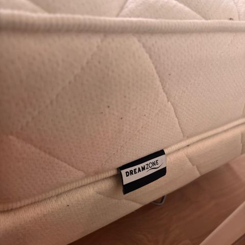 Sengene har fået klippet betræk hvor de støder op mod hinanden, da det var meningen vi ville skrue dem sammen. Derfor den lave pris.