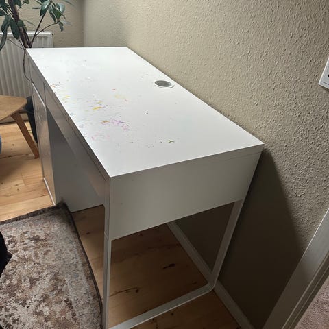 Ikea skrivebord med skuffer. Synlige brugsspor på overfladen.