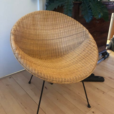 Fin Kurve stol fremstår brugt med mindre skader i fletværket på siddefladen som kan repareres.