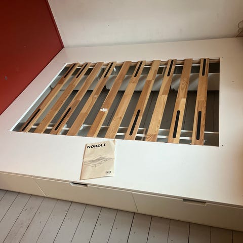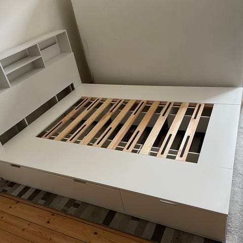 IKEA NORDLI seng med opbevaring i hvid. Sengen består af en sengebund, madras samt integrerede skuffer (6stk) til opbevaring.