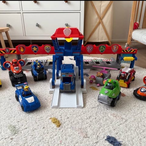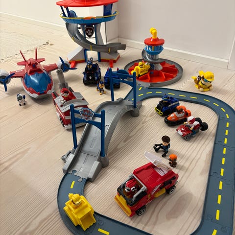 Paw Patrol legetøjssæt med flere dele. Sættet indeholder en samling af køretøjer i forskellige farver og størrelser samt flere figurer fra Paw Patrol-universet. Der medfølger også tilbehør i plast, herunder mindre bygge- eller legeelementer. Egnet som samlesæt til leg med Paw Patrol-tema, hvor børn kan kombinere figurer, køretøjer og tilbehør i forskellige lege- og redningsscenarier.
