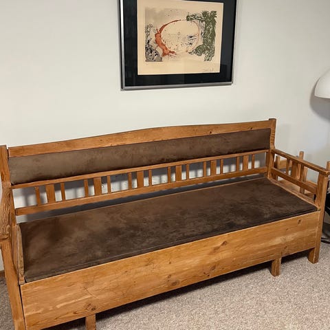 Gammel slagbænk hvor sædet kan åbnes op til opbevaring under