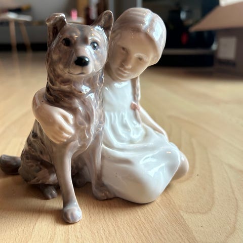 Figuren forestiller en dreng, der kærligt omfavner sin gravhund – meget fin detaljering og varm udstråling. Perfekt til samler eller som gave.