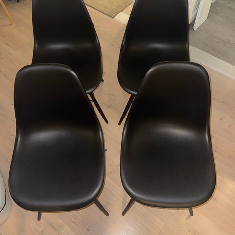 4 Eames-lignende spisebordsstole fra ukendt mærke. De er brugt og knirker en smule men er ellers i god stand (kan sikkert godt fikses, har ikke prøvet:))