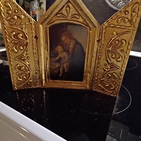 Ovalt religiøst billede med Madonna og barn i guldramme