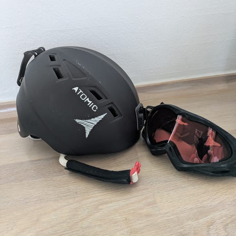 Atomic skihjelm med integreret visir i sort. Hjelmen har indbygget visir, der kan vippes op og ned, og polstrede øreklapper med justerbar hagerem. Indersiden er polstret for komfort. Velegnet til alpint skiløb og snowboarding.