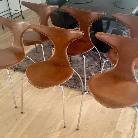 Vi har været meget glade for dette sæt — det har samlet familien til måltider, givet plads til gæster og skabt et samlet udtryk i vores hjem. Desværre passer stolene ikke ind i den nye boligindretning, og derfor får de nu lov at flytte videre til et hjem, hvor de kan få glæde af dem igen.