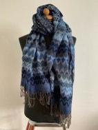 fantastisk blødt og behageligt materiale og kvalitet. Blå nuancer i zigzag mønster og med frynser.